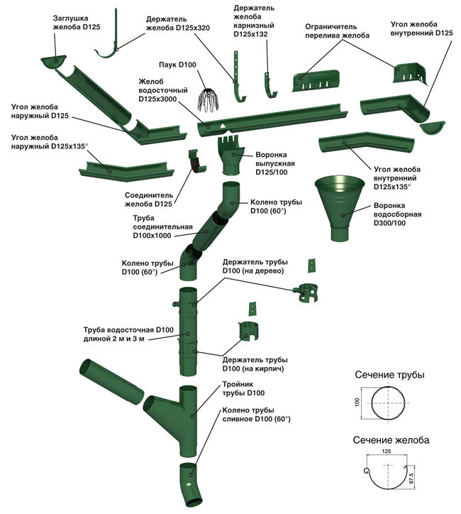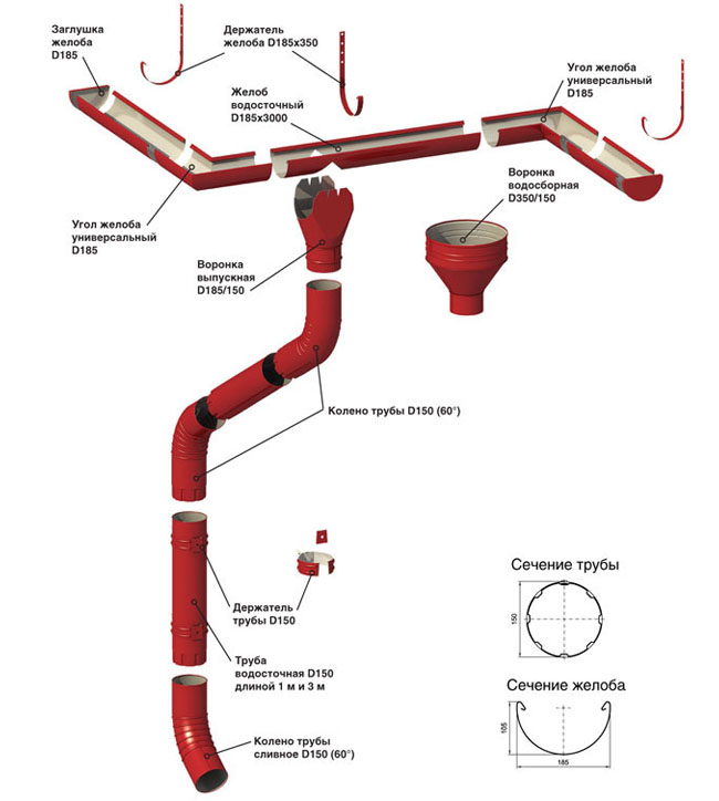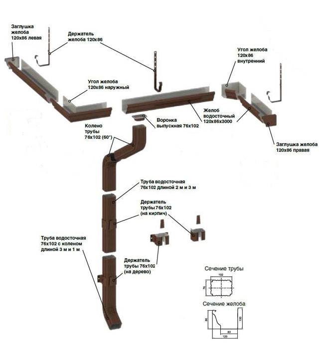 Основные элементы конструкции водостока: